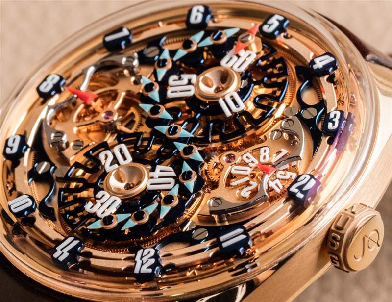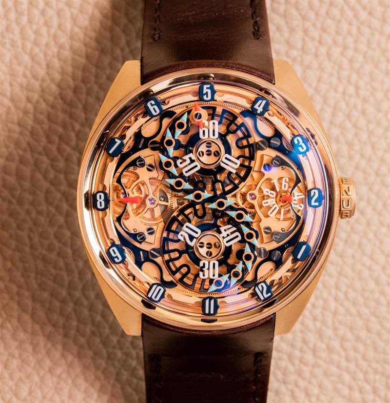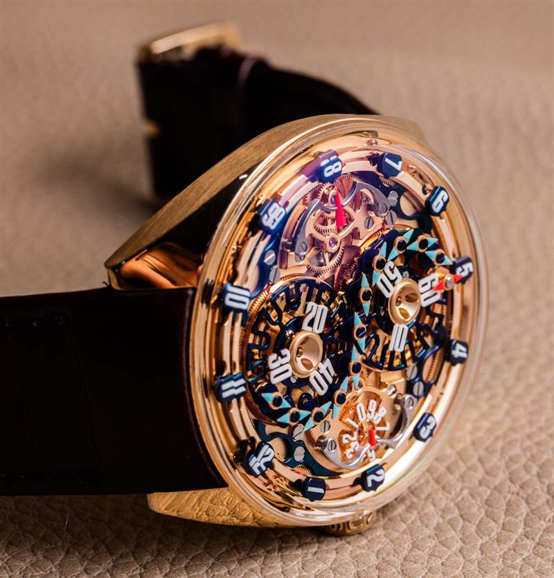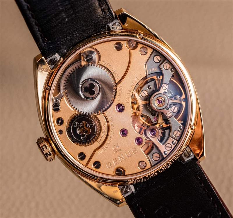 手表內(nèi)部的機芯是 Genus calibre 160,它是手動上鏈的,由 418 個零件組成(其中許多零件可能在復(fù)雜的時間指示系統(tǒng)中)。機芯以 2.5 赫茲(18,000 次/小時)的頻率運行,動力儲存為 50 小時。該機芯包括一個底座以及一個用于特定時間指示系統(tǒng)的底座上的模塊。這意味著在未來,Genus 可以重新設(shè)計部分時間指示系統(tǒng)(或添加到其中),同時保持相同的基本運動架構(gòu)。