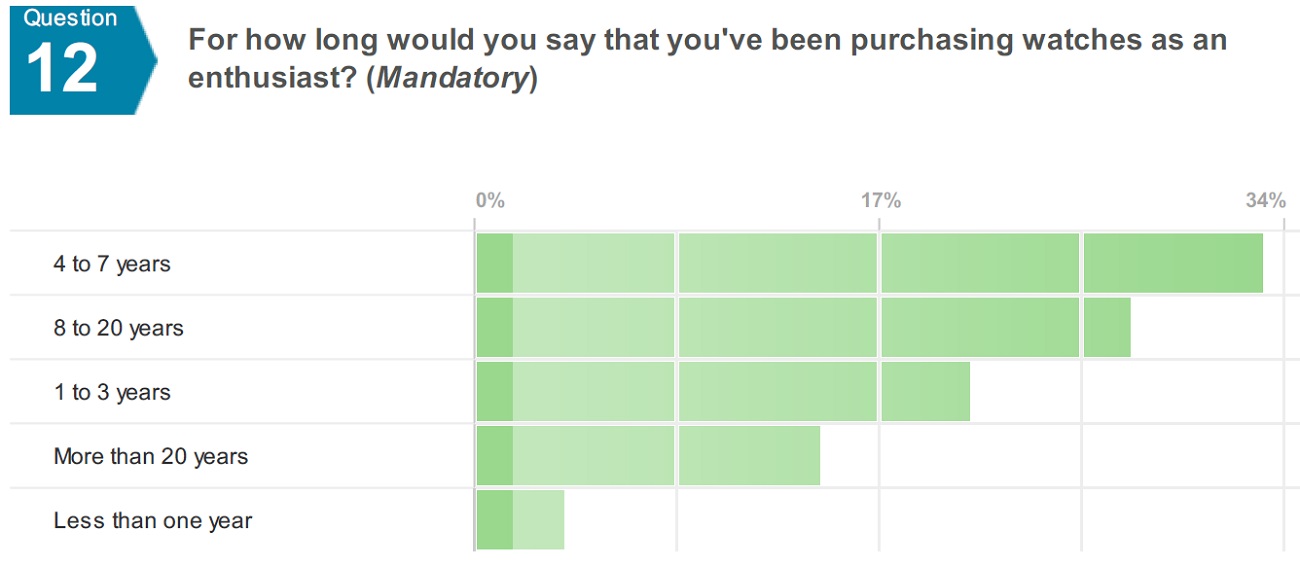 我發(fā)現(xiàn) aBlogtoWatch 非常有趣的一點(diǎn)是,它已經(jīng)發(fā)展成為成熟收藏家的平臺(tái)。只有25%的觀眾收藏不到三年,只有4%的人收藏不到一年。因此,98% 的人擁有超過 2 塊手表,59% 的人擁有 5 到 30 塊手表也就不足為奇了。據(jù)報(bào)道,有 2% 的人擁有 100 多塊手表。廣告訊息廣告信息結(jié)束