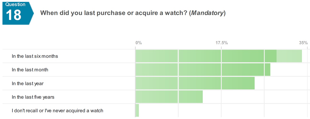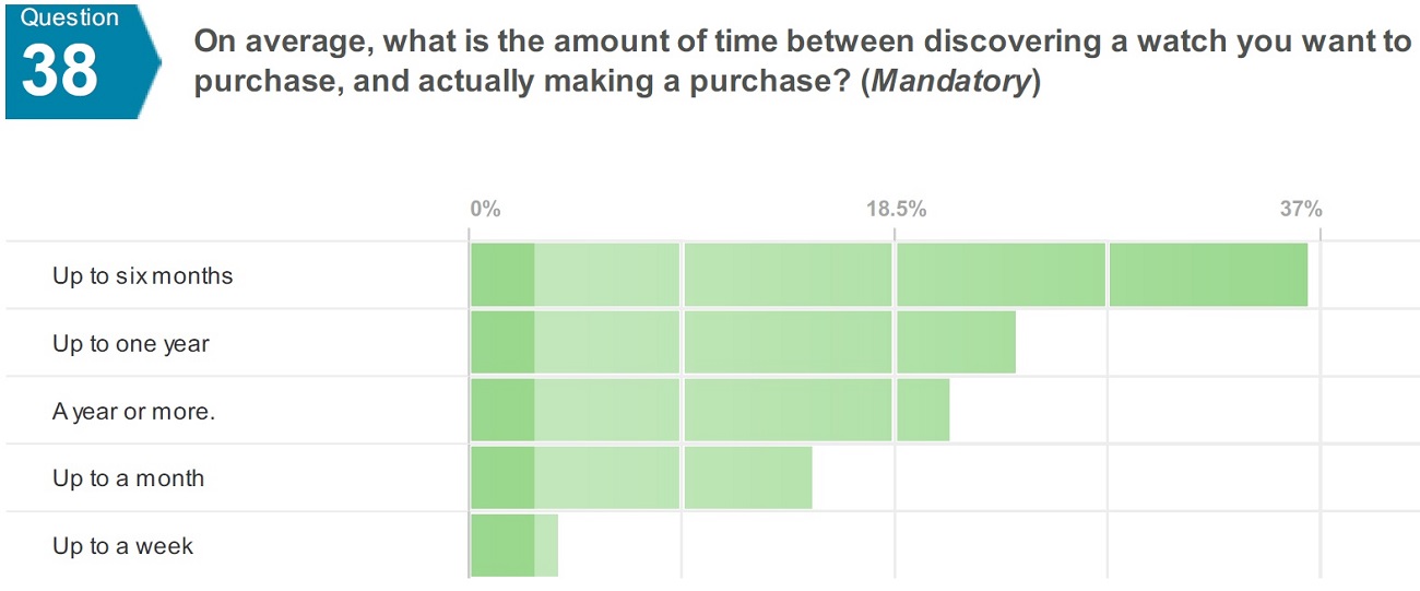 您還花費(fèi)大量時(shí)間閱讀手表和查看評論。72% 的人每天觀看媒體,而 96% 的人至少每周向互聯(lián)網(wǎng)鐘表之神祈禱。幾乎沒有人在不做大量研究的情況下購買手表,而且考慮購買也需要時(shí)間。大多數(shù)手表愛好者需要 6-12 個(gè)月 (63%) 在您第一次對手表感興趣后做出購買手表的決定。46% 的人似乎更喜歡已經(jīng)存在了一段時(shí)間的手表品牌,44% 的人對歷史悠久的和新成立的手表品牌同樣感興趣。