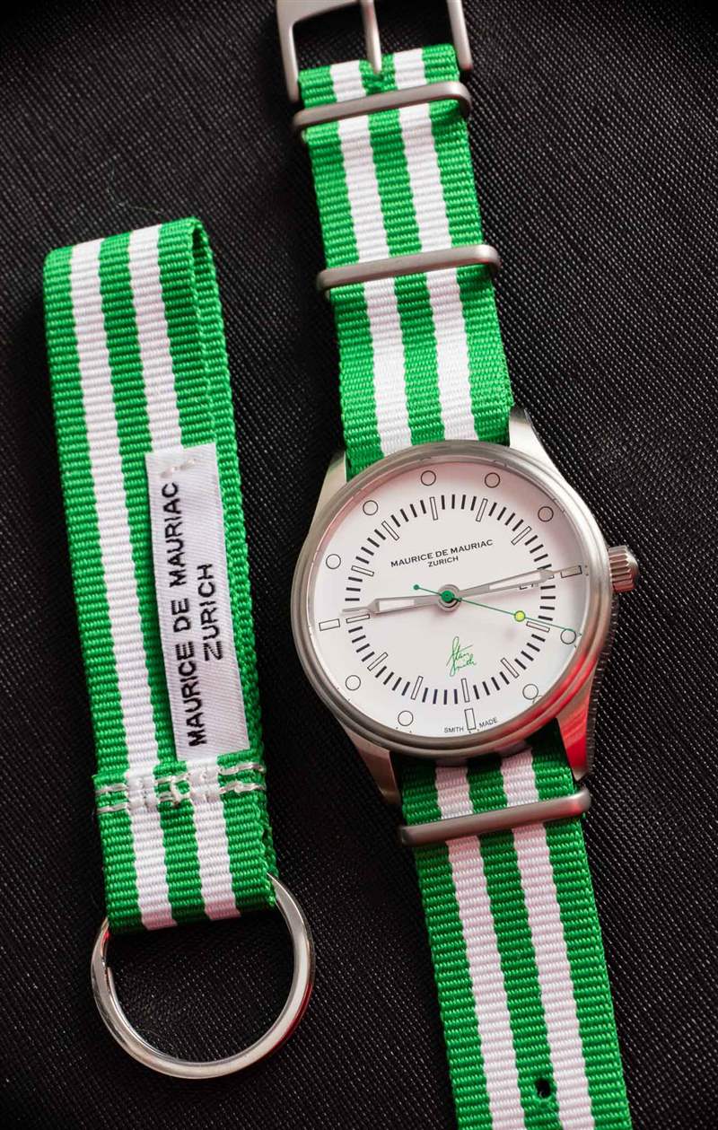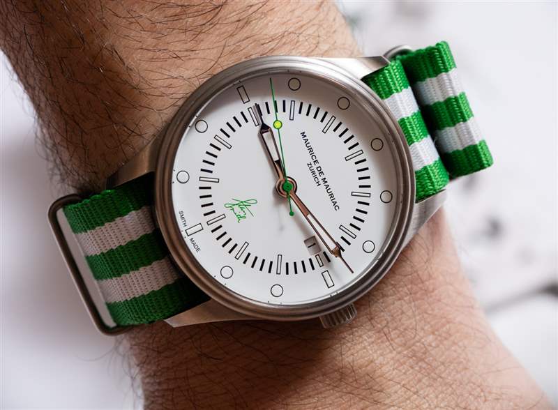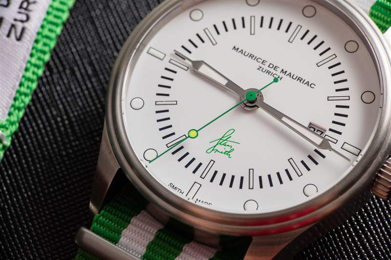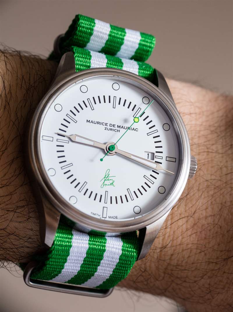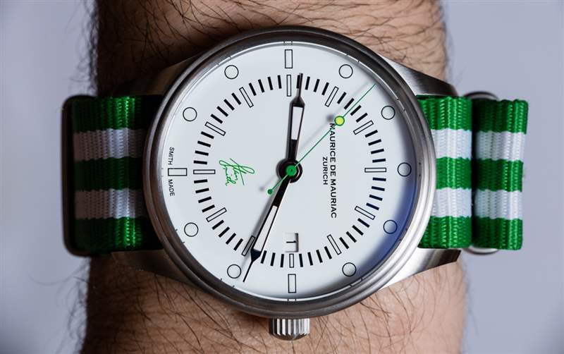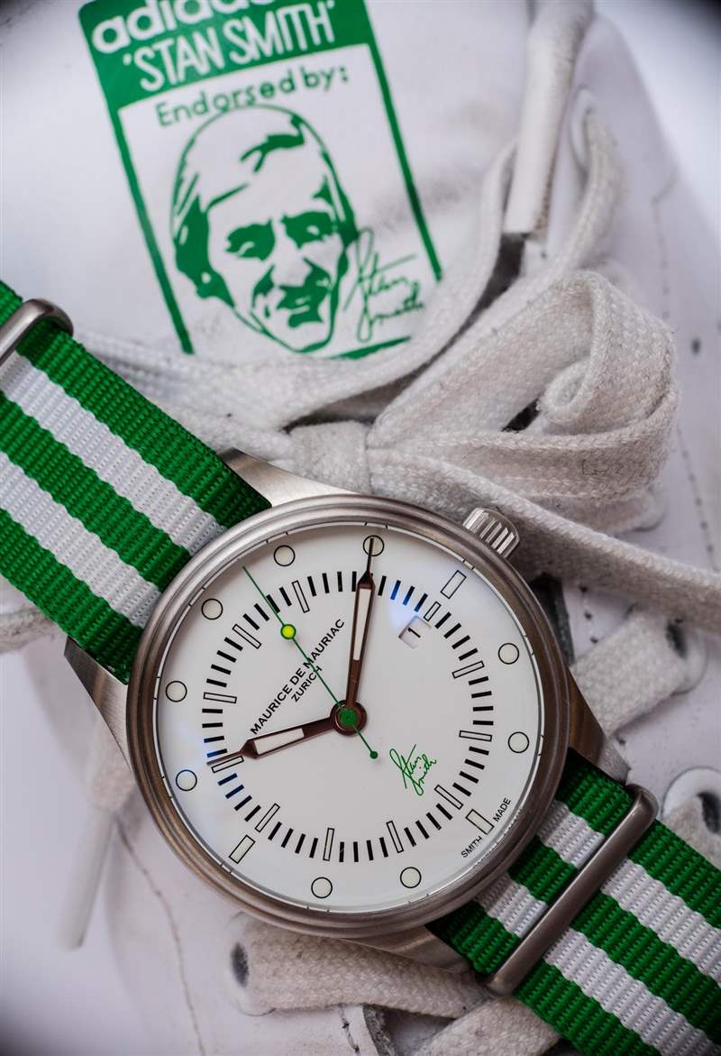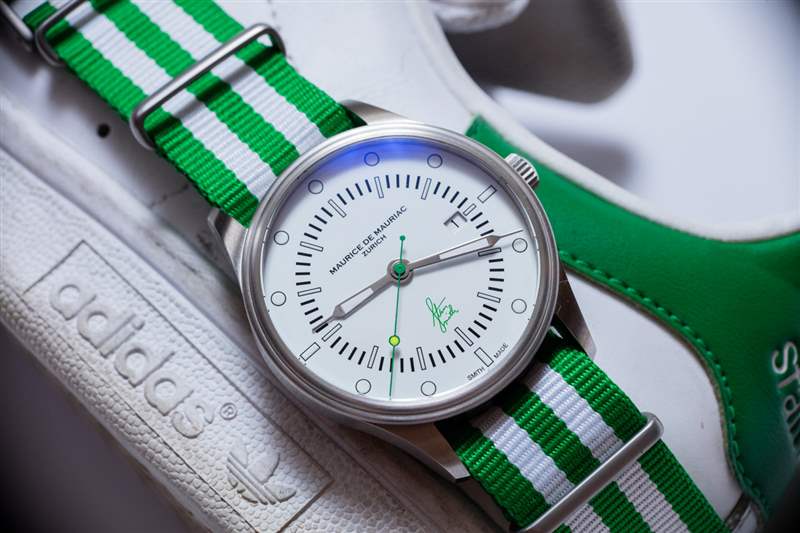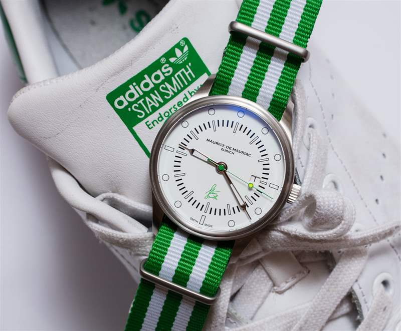 Maurice de Mauriac?Stan Smith Signature 手表是對這個蘇黎世品牌所享受的消遣的頌歌(嗯,至少其中一個)。自從我認識 Daniel Dreifuss(Maurice de Mauriac 的創始人)以來,他就喜歡網球和運動鞋。在這款腕表中,他既慶祝了這兩者,也慶祝了時尚偶像。就在兩天前,我在一次會議上注意到一位紳士穿著由阿迪達斯生產的標志性的、大部分為白色、帶有綠色飾邊的網球鞋,鞋舌上有 Stan Smith 的臉。