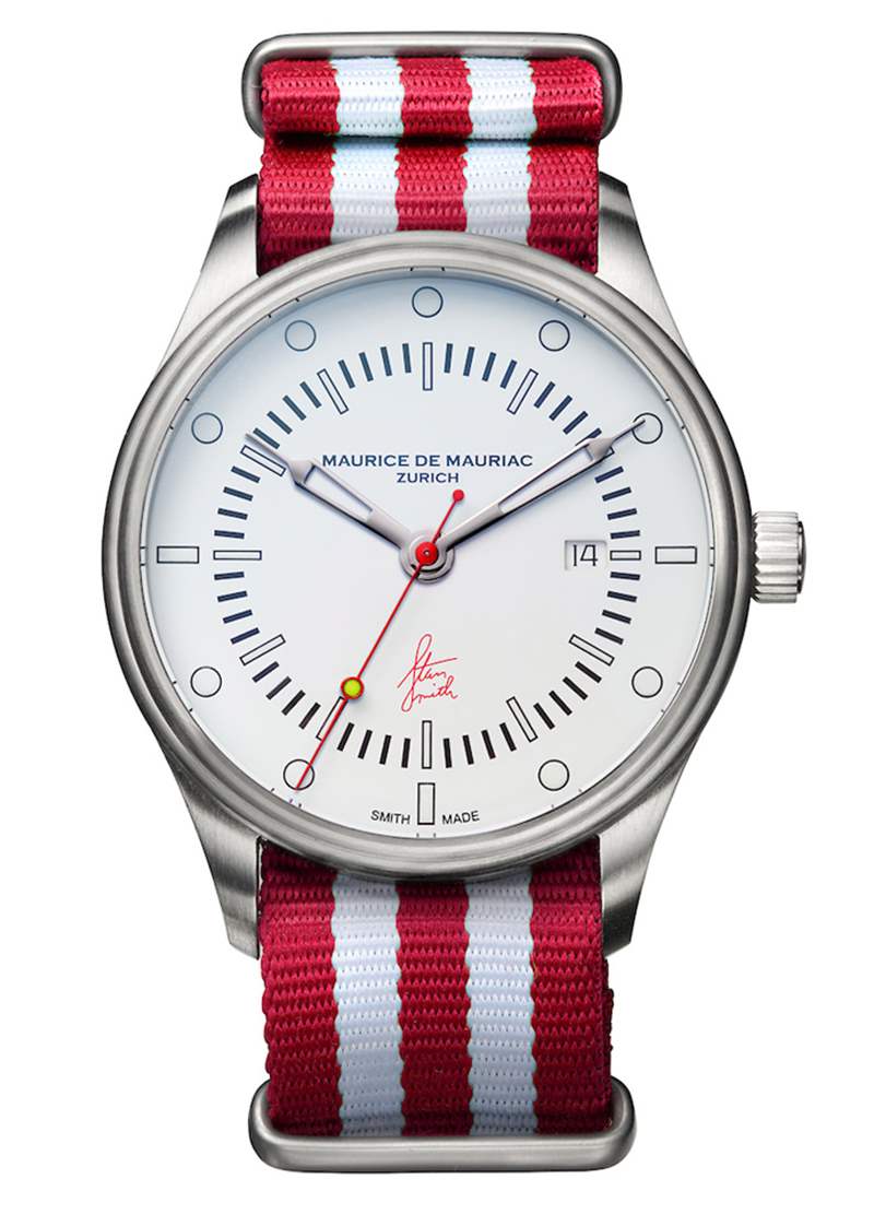 在 Stan Smith 手表項目的最后一分鐘,Maurice de Mauriac 實際上決定發布兩款手表的額外配色——每一款都是限量版 100 枚——分別是白色和藍色以及白色和紅色。所有手表的共同點是“網球”秒針,它在運行的秒針上投射出夜光點,看起來像一個小網球,很容易成為手表上最好的細節之一。這個細節實際上是從一個廉價的阿迪達斯品牌手表系列(有幾種形式)中借來的,該系列也是獻給斯坦史密斯的。Maurice de Mauriac Stan Smith 手表的另一個重要細節是表盤上的“Swiss Made”被“Smith Made”諷刺性地替換。