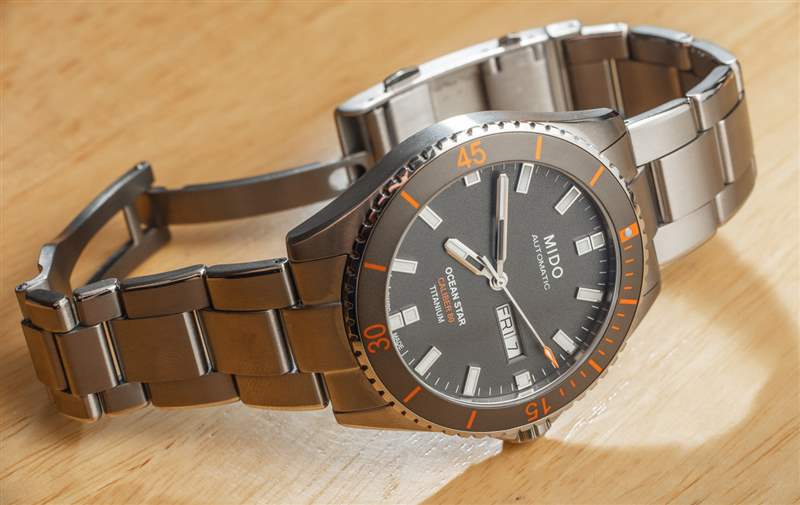 斯沃琪集團以極具競爭力的價格組裝出一款非常稱職的手表的能力來自于 Mido Ocean Star。外殼精加工和整體施工質量非常好。鈦金屬手表的這種修飾方式預計會比這款大約 1,000 美元產品的價格高出許多倍。這不僅是鈦金屬上的嚴格公差和良好的表面處理,而且表殼和表鏈上都具有大量拋光而不僅僅是拉絲表面的對比處理。Mido 實際上在匹配的鈦表鏈和橙色橡膠表帶選項中都提供了這種精確的海洋之星鈦。鈦手鏈的零售價僅為 40 美元!因此,我強烈建議您購買手鏈以便擁有它,