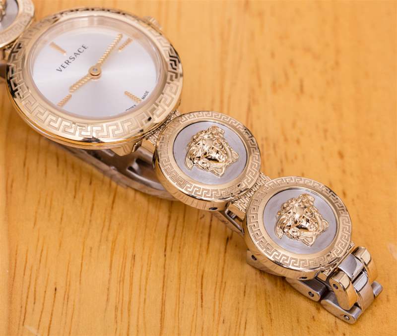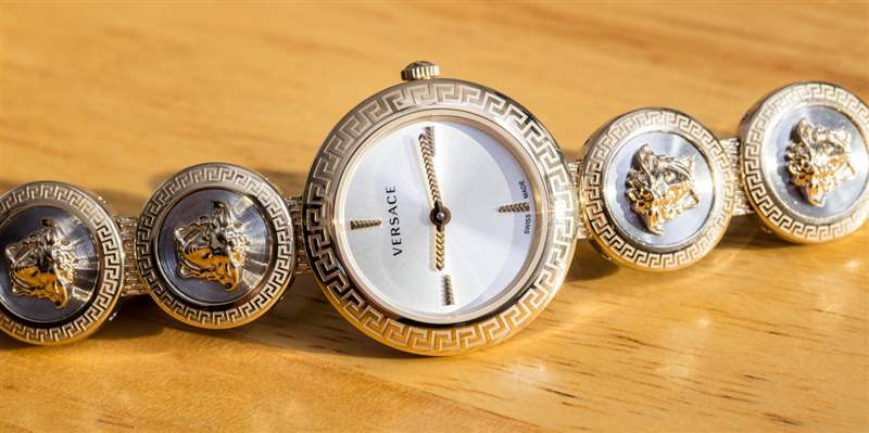 范思哲目前(通過 Timex 集團)生產四個版本的 Medusa Stud Icon。這款參考 VERF00818 采用拋光鋼和鍍金 IP 涂層鋼兩種色調(實際上,范思哲將顏色稱為“香檳色”)。這是這款腕表唯一的雙色調版本,其他款式要么全為黃金色調,配以匹配的黃金色調或黑色表盤,要么為全玫瑰金色調。表殼寬 28 毫米(防水深度達 50 米),帶有迷人而簡單的表盤,由瑞士制造的石英機芯(Ronda caliber 751)提供動力。表盤上方是藍寶石水晶。