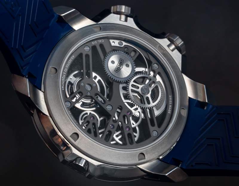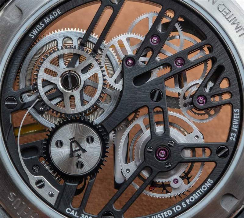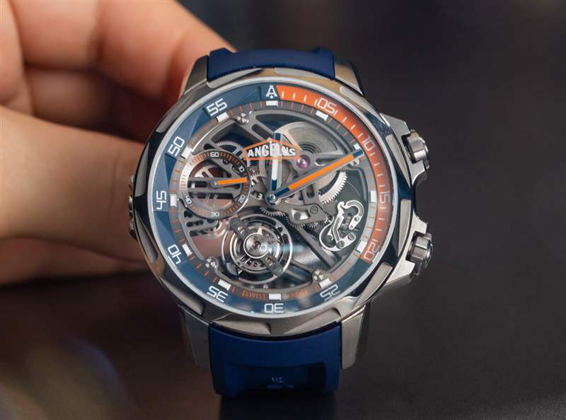 Angelus U51 Tourbillon Diver 也是內(nèi)部生產(chǎn)的,包括鏤空和手動上鏈的 A-310 機芯,工作頻率為 4Hz,具有 5 天(120 小時)的良好動力儲備。有趣的是,它既有傳統(tǒng)的小秒盤,也有通過陀飛輪窗口顯示的秒針。該機芯在其他方面被設(shè)計為實用和纖薄,以及鏤空。重要功能包括用于增加可靠性的調(diào)節(jié)系統(tǒng)中的硅和用于增加耐用性的滾珠軸承式陀飛輪保持架。作為高級鐘表產(chǎn)品,當然有手工完成,但這不是 A. Lange & Sohne 的機芯。然而,它確實代表了我們在偉大的保守品牌中很少看到的思想開放和鼓舞人心的東西。
