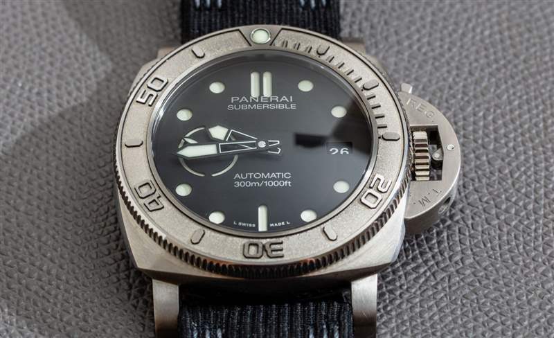 沛納海指出回收的生態鈦表殼是手表高成本的主要部分。據他們說,回收和重鑄鈦所需的工藝非常昂貴。這與許多其他“可持續”材料一致,因為它們仍然比“原始”材料更昂貴。無論如何,Eco-Titanium 仍然是鈦,它構成了精細加工的 5 級鈦潛水表殼,這里有 47 毫米寬(不包括表冠),防水 300 米,因為這是潛水員風格的潛水系列手表. 沛納海 (Panerai) 是為數不多的手表在手腕上仍然看起來不錯的少數品牌之一,鑒于其鈦表殼材料,Submersible PAM984 的所有尺寸都可預見的舒適且重量輕。表殼厚約 15 毫米,凸耳到凸耳的距離約為 56 毫米。表盤上方是一個鍍有 AR 涂層的圓頂藍寶石水晶,實際上它的圓頂比我戴過的其他沛納海手表要少一些。較少的圓頂有助于減少眩光,從而提高表盤的易讀性。