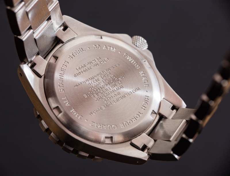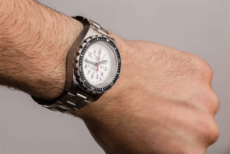 搭配相配的 316L 不銹鋼表鏈(您也可以在黑色橡膠表帶上購買)也可以幫助手表呈現最佳外觀。雖然您可以在 Marathon Medium Diver 的 Quartz Ghostbuster 上放置任意數量的 18 毫米寬的表帶,但我認為三連桿拉絲鋼表鏈看起來最帥氣。手鐲不僅具有迷人的錐形(重要的視覺觸感),而且還使用厚實的螺釘來固定鏈節。但是請注意,要確定手鐲的尺寸,您需要在螺絲的兩側使用螺絲刀——這意味著可能需要一些特殊工具。手鐲有一個折疊式展開式表扣,有點“上一代”,但可以完成工作。如果您需要將手表戴在大夾克或潛水服上,它還具有折疊式潛水員的延伸部分。