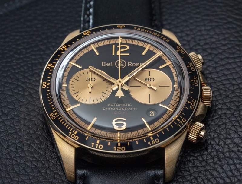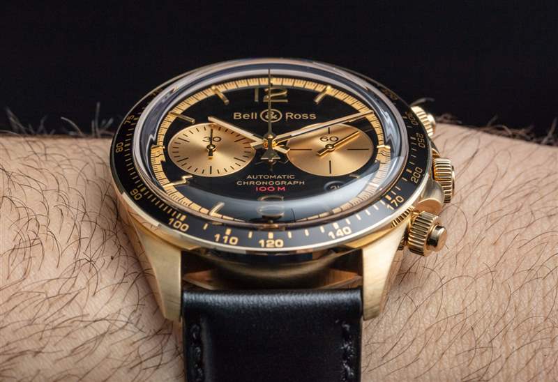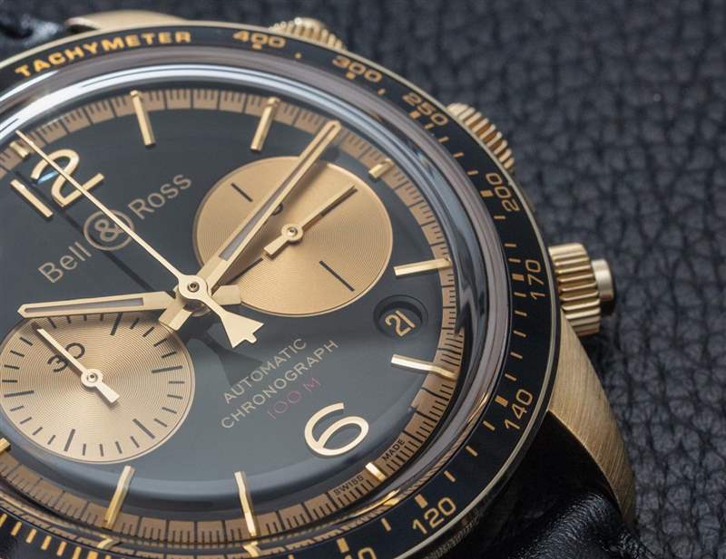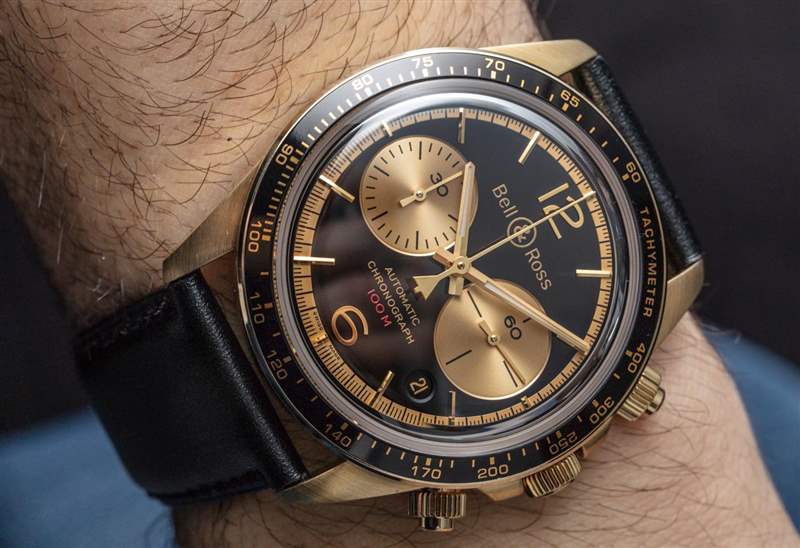設(shè)計(jì)精美的Bellytanker Bronze 表盤帶有黑色和金色,帶有一絲紅色。金色的小表盤觸感很好,讓我想起某些永恒玫瑰金勞力士迪通拿手表型號(hào)的調(diào)色板。正如我上面所說,Bell & Ross 沒有選擇氧化青銅,而是選擇了一種穩(wěn)定的青銅合金。這是一個(gè)重要的區(qū)別,因?yàn)閹椭占扒嚆~作為現(xiàn)代手表材料的青銅合金,事實(shí)上,隨著時(shí)間的推移,“銅綠”。這款帶有青銅表殼(以及其他一些手表)的 Bell & Ross 選擇了一種不會(huì)氧化并隨后產(chǎn)生銅綠的金屬合金。當(dāng)然,手表會(huì)刮花,但隨著時(shí)間的推移,它不會(huì)開始變綠或變黑。我更喜歡穩(wěn)定的青銅,通常情況下,鑒于 BR V2-94 Bellytanker Bronze 的外觀更別致(而不是古董),