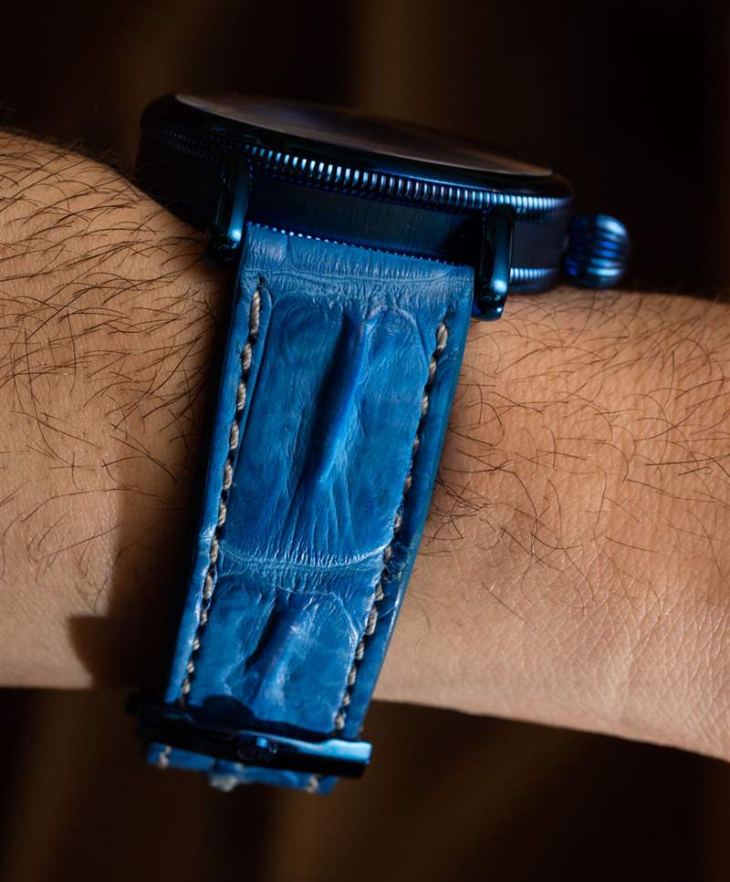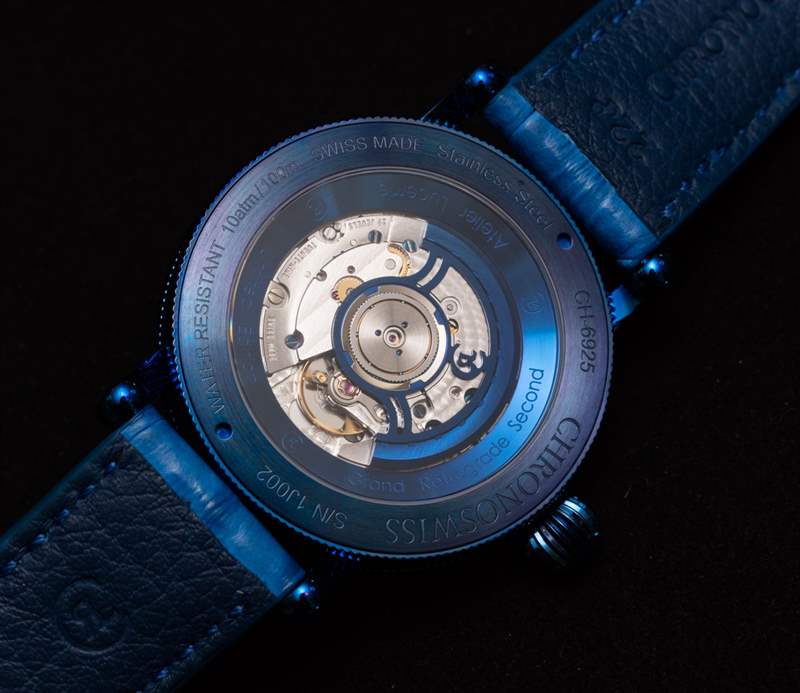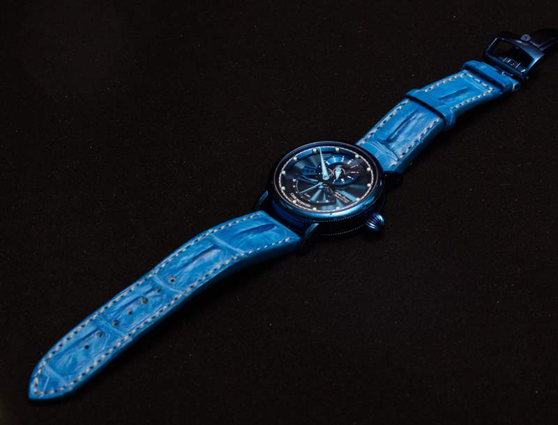 正如我上面提到的,“ReSec”是 Chronoswiss 的“逆行秒”的簡稱。有時您可能會看到這款手表的(深呼吸)更長的全名,即“Chronoswiss Flying Grand Regulator Open Gear Retrograde Seconds”。現在你知道我為什么告訴 Chronoswiss,“只要把這個特殊的模型稱為 Blue Note。” 聽起來不是更好嗎?藍色本身很醒目,在表殼上,它以藍色 DLC 涂層的形式出現在基礎鋼層上。Chronoswiss 將表殼搭配藍色 Hornback 鱷魚皮表帶,以及藍色表盤和藍色指針。這可能是今年最藍的手表!