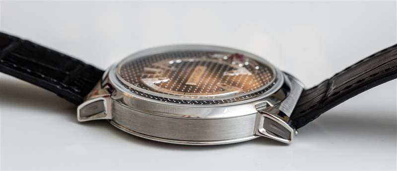 IO Double Orbitale 的另一個令人印象深刻的地方是外殼的輕薄特性。IO 收集箱寬 43 毫米,厚僅 10 毫米。盡管它是傳統的圓形表殼,但表殼周圍的一系列小細節賦予了它很多個性,包括表圈和表耳設計。這款 IO 表殼防水深度達 30 米,提供 18k 玫瑰金或拋光鈦金屬材質。兩種表盤顏色均提供鈦金屬和 18k 玫瑰金表殼材質選項。與表殼相連的是一條鱷魚皮表帶,帶有 Hysek 自己風格的折疊展開式表扣。廣告訊息廣告信息結束