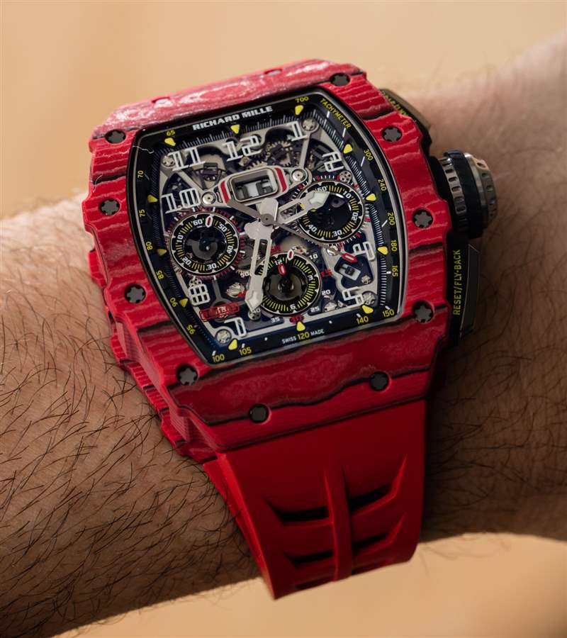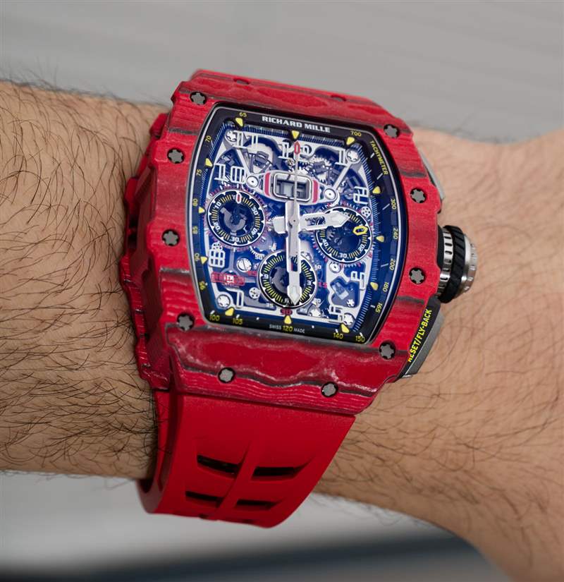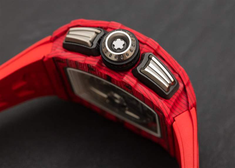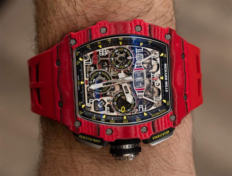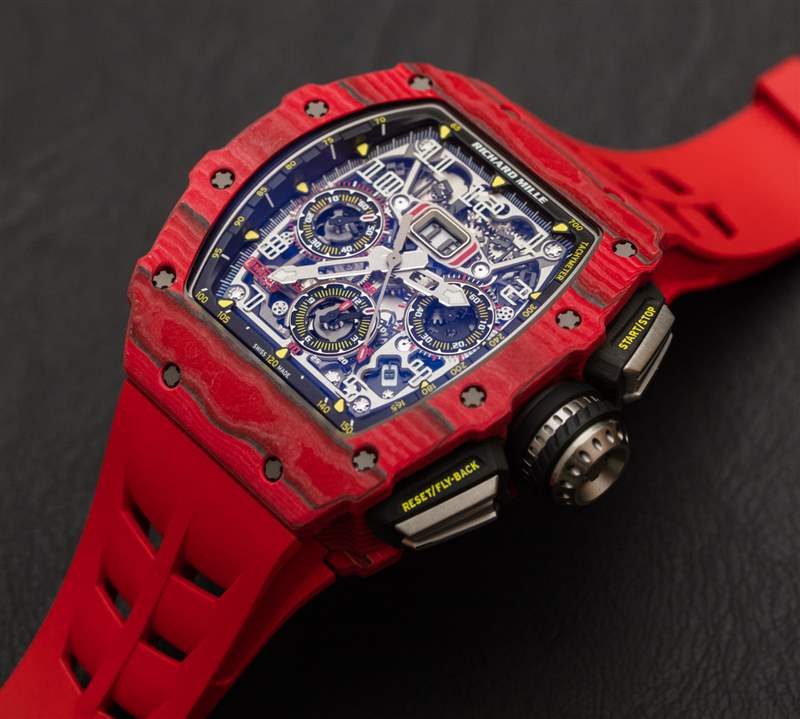 Richard Mille 最新的 RM 11-03 表殼具有獨(dú)特的結(jié)構(gòu),其中機(jī)芯固定在作為表殼一部分的支架上,而不是單獨(dú)的機(jī)芯固定環(huán)。這個(gè)和其他細(xì)節(jié)是可能的,因?yàn)槔聿榈旅桌諡槠淞慵圃炝撕荛L(zhǎng)的加工時(shí)間(這些手表成本如此之高的原因之一)?;⌒尉仆靶伪須?44.50 毫米(不包括表冠),高 44.94 毫米,厚 16.15 毫米。佩戴在手腕上的定制和非常高端的橡膠表帶,除了視覺上的自信外,佩戴體驗(yàn)非常舒適。