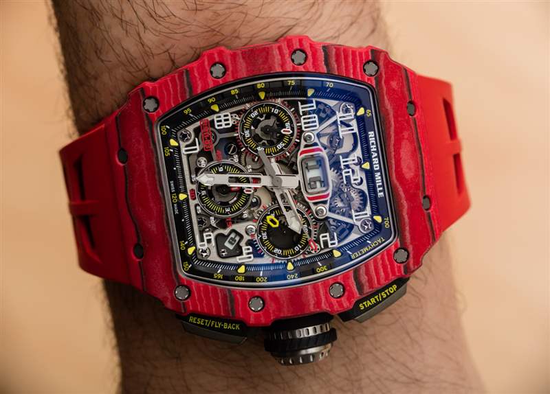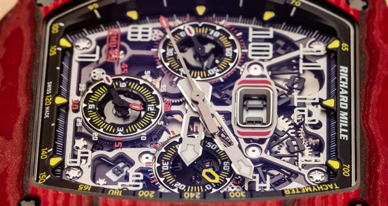 RMAC3 機(jī)芯包括飛返式計(jì)時(shí)碼表(重新啟動(dòng)前無需重置計(jì)時(shí)碼表)、12 小時(shí)計(jì)時(shí)盤(小時(shí)和分鐘計(jì)在同一個(gè)表盤中)、同步 60 分鐘倒計(jì)時(shí)表盤和大日期指示器和月份指示器整齊地放置在表盤的 4 點(diǎn)和 5 點(diǎn)之間。這使得 RM 11-03 成為計(jì)時(shí)碼表年歷——它確實(shí)存在,但它是一種非常罕見的機(jī)制。從視覺上看,RM 11-03 表盤清晰易讀,但采用鈦合金橋板和大量視覺深度設(shè)計(jì)以引人注目的方式鏤空,以放大表盤在眼睛中的外觀。大膽的指針和明亮的表盤顏色有助于保持易讀性。廣告訊息廣告信息結(jié)束