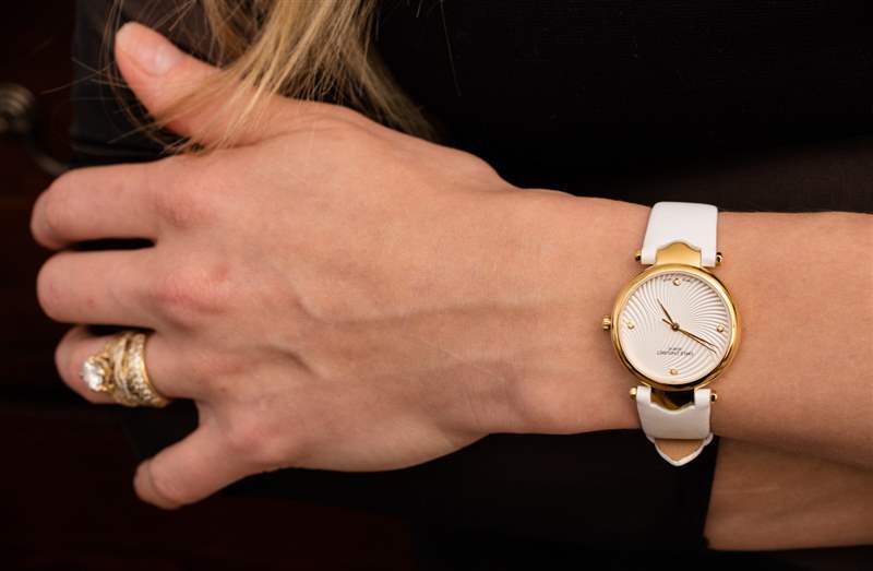 Fair Lady 手表系列的芭蕾舞女演員版本以其“旋風式”表盤而著稱,據該品牌稱,該表盤旨在喚起芭蕾舞女演員旋轉絲綢短裙的外觀。我當然可以看到紋理表盤圖案和飛裙之間的相似之處。該表還在主要小時指針處包括四顆小鉆石,但在其他方面是一個相對干凈和簡單的表盤。其他 Fair Lady 手表有不同的表盤選項,以及其他不同的表殼尺寸。