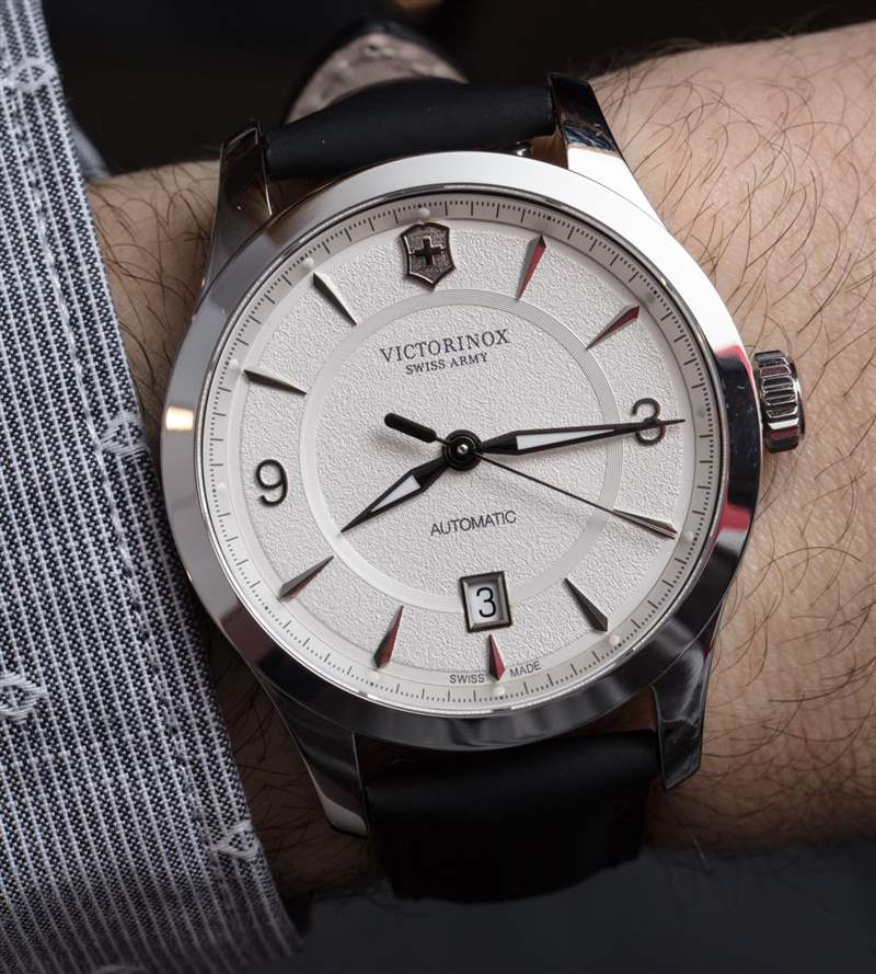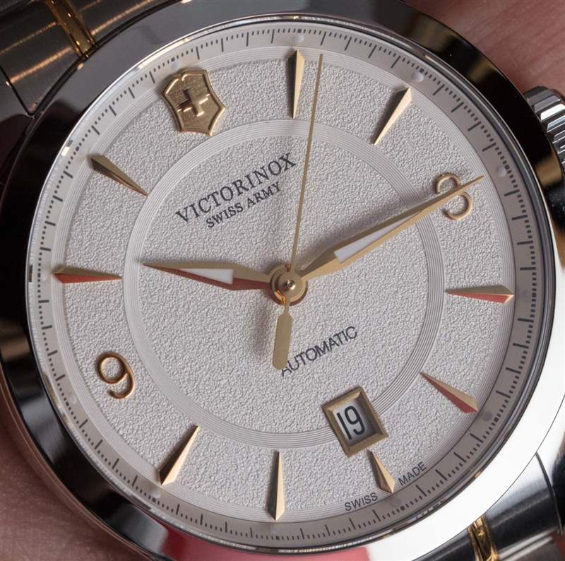 我發(fā)現(xiàn)這款手表特別吸引人的是清晰易讀(以及對稱設(shè)計)的表盤,它可以正確使用比例以及表面光潔度。Victorinox Swiss Army 巧妙地將拋光指針和時標(biāo)與啞光“粉末”紋理表盤相結(jié)合,使拋光表面具有光澤度,同時保持強(qiáng)烈的視覺對比,便于閱讀。對于藍(lán)色表盤上的表殼來說,情況可能不太好,但白色表盤(兩者)很容易成為這個系列的贏家。Victorinox Swiss Army 需要決定生產(chǎn)什么顏色以及與表盤選擇搭配什么表帶顏色,因為他們不能發(fā)布無限的 SKU。然而,我確實,