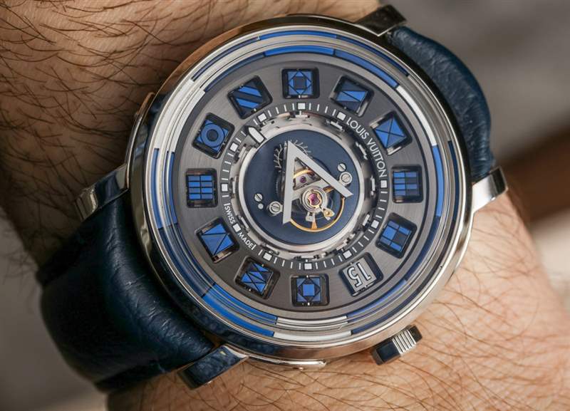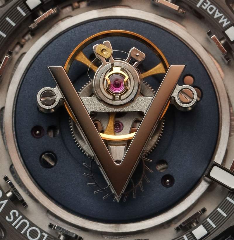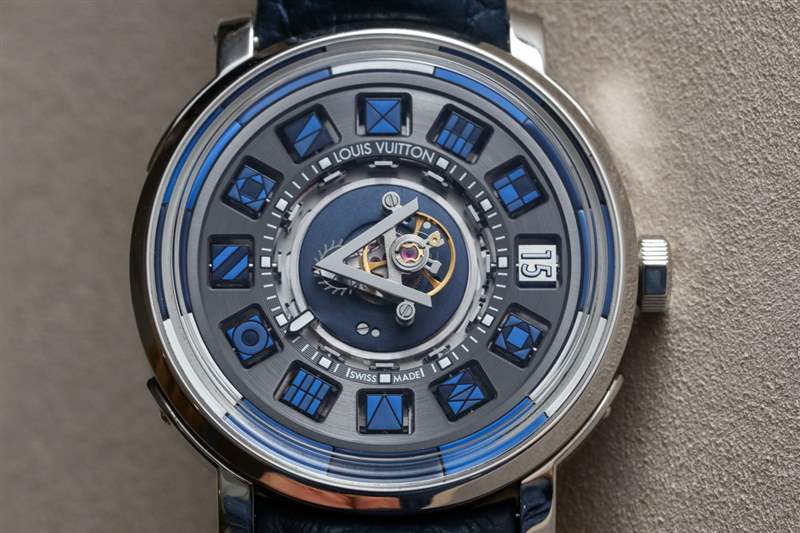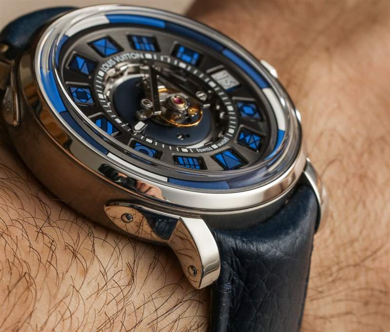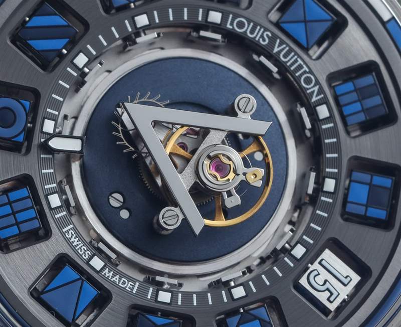 在真正的品牌時(shí)尚中,陀飛輪框架的形狀看起來(lái)像“Vuitton”的“V”。在我看來(lái),它以可愛(ài)的啞光藍(lán)色表面為背景,飛行陀飛輪的視覺(jué)體驗(yàn)真的很帥很吸引人。該機(jī)芯被稱為 Louis Vuitton LV 92,它是一種自動(dòng)機(jī)芯,帶有一種隱藏的自動(dòng)轉(zhuǎn)子,可以在手表背面查看其運(yùn)動(dòng)。您可以在我的 aBlogtoWatch 對(duì) Louis Vuitton Escale Time Zone 39 手表的評(píng)論中看到更多關(guān)于這個(gè)轉(zhuǎn)子的外觀和更多關(guān)于 Escale 風(fēng)格表殼的?信息。LV 92 自動(dòng)機(jī)芯以 4 赫茲(28,800 次/小時(shí))運(yùn)行,動(dòng)力儲(chǔ)存 40 小時(shí)。我相信這是一個(gè)基礎(chǔ)機(jī)芯,頂部有一個(gè)用于 Spin Time 和飛行陀飛輪系統(tǒng)的模塊。
