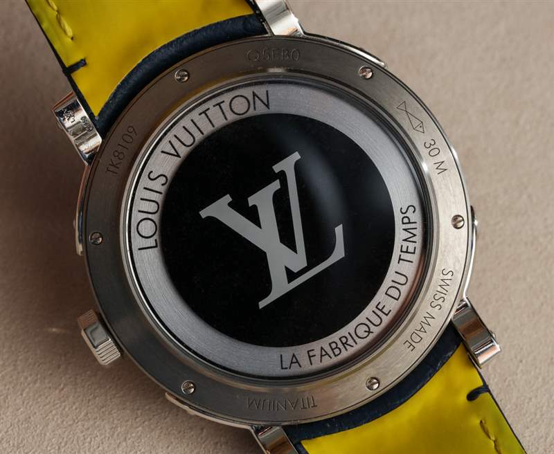 總的來(lái)說(shuō),我非常喜歡 Escale 機(jī)箱。它比品牌的 Tambour 表殼更加考究,表耳結(jié)構(gòu)設(shè)計(jì)靈感來(lái)自過(guò)去的路易威登行李箱。同樣,這個(gè)型號(hào)有一個(gè) 41 毫米寬的表殼,實(shí)際上在 12.8 毫米處并不太厚。它的防水深度為 30m,當(dāng)然,正面和背面都有雙藍(lán)寶石水晶,由鈦和 950 鉑金零件制成。多么有趣的組合,我們每天都看不到。中間表殼為拉絲鈦金屬,而表耳、表冠和表圈則為 950 鉑金。附在表殼上的是一條藍(lán)色鱷魚(yú)皮表帶,帶有涼爽的黃色橡膠襯里,提高了舒適度和表帶的整體壽命。