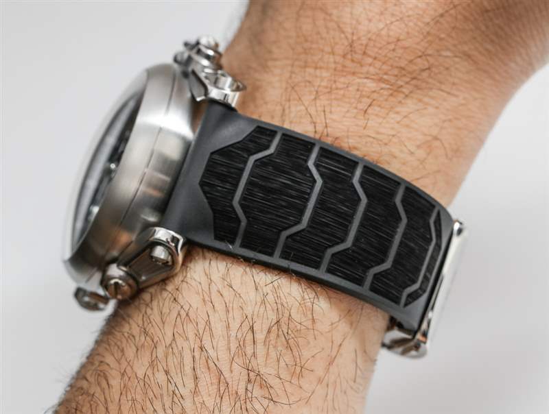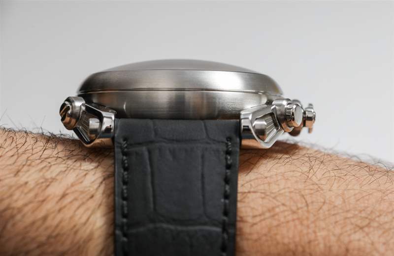 表殼本身是 44 毫米寬的鋼制。44 毫米是一個(gè)謙虛的術(shù)語,因?yàn)樗话▋?nèi)殼,而不包括復(fù)雜的表耳結(jié)構(gòu),表殼右側(cè)與計(jì)時(shí)按鈕和表冠融為一體,共同將手表的寬度推至約 50 毫米寬。凸耳到凸耳的距離約為 52 毫米。內(nèi)殼非常受 Ikepod 啟發(fā),而表耳似乎暗示了一種更加機(jī)械和前衛(wèi)的感覺。我認(rèn)為這個(gè)元素很好地使 Chrono-Tour 設(shè)計(jì)看起來更加獨(dú)特,并有助于賦予手表更年輕、更陽剛的個(gè)性。有趣的是,這種表殼(也防水 100m)佩戴起來相當(dāng)舒適。你確實(shí)需要它在手腕上相對(duì)舒適,但我很欣賞人體工程學(xué),考慮到整體設(shè)計(jì),這并不明顯。