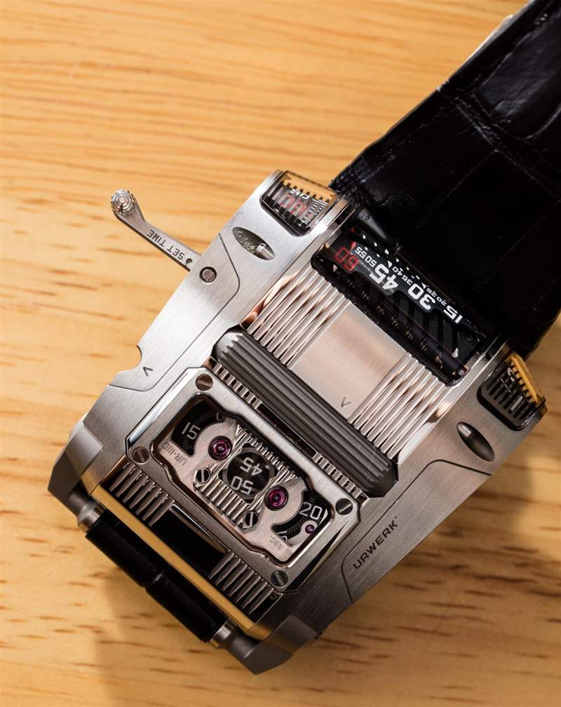 我對手表的另一個抱怨是易讀性。在我看來,根本沒有足夠強調指示小時,而在左側指示小時和在右側指示分鐘(再次)的側窗使用藍寶石水晶內部的薄金屬片應用來創建表盤/標記的外觀。這些元素反射過多的光線,使您的眼睛很難看清需要去哪里。你可能會習慣它,但我認為這個細節可以在未來版本的手表中使用更好的改進。分鐘顯示兩次。首先使用表殼中央的線性指示器,然后再次使用手表右側的轉動鼓式指示器。我以前以為手表沒有發光體,然后我意識到我忽略了這只手表確實有流明數字和標記。這包括正面指示器以及外殼頂部安裝的秒指示器。發光體的印刷非常淺,因此需要大量光線才能充電,但一旦全部點亮,UR-111C 在黑暗中看起來真的很酷。