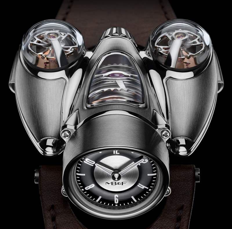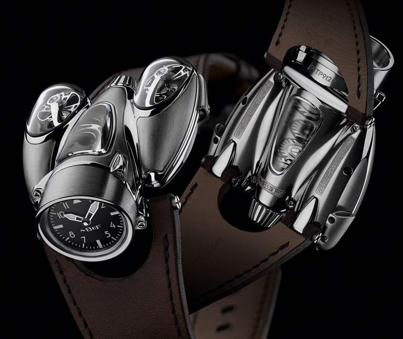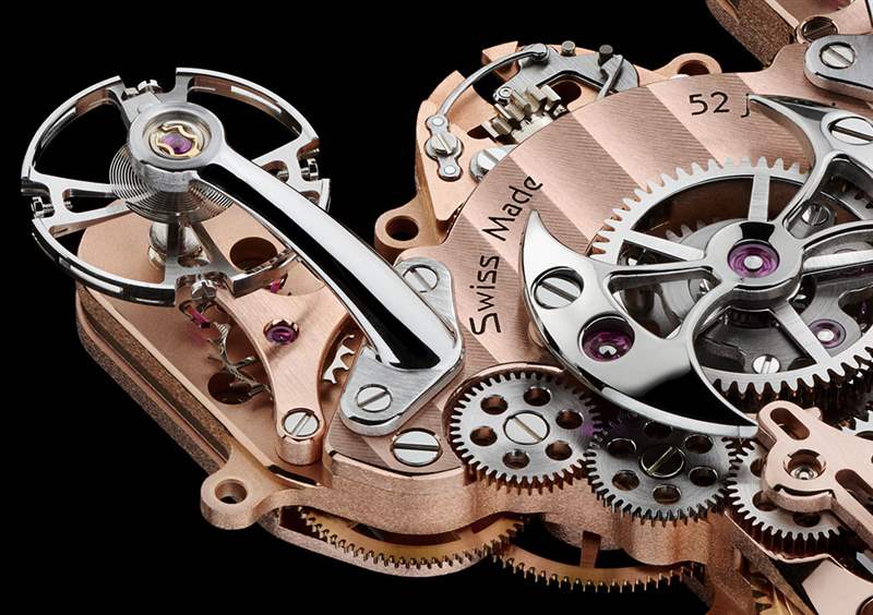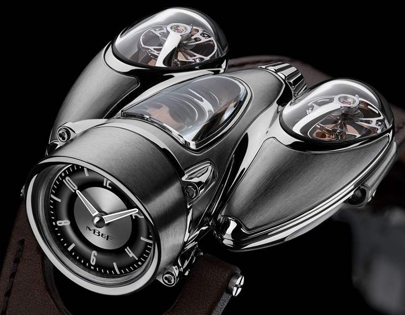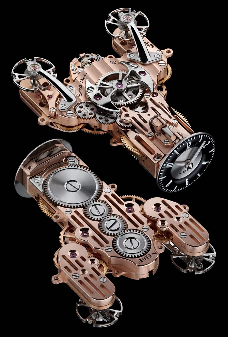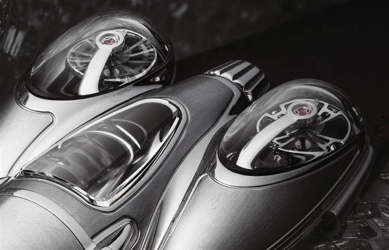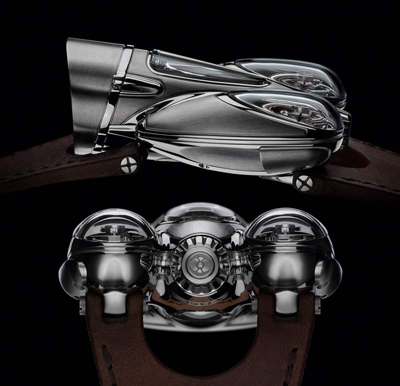 從鐘表上講,兩個平衡輪將通過差速器連接到同一個運行的火車上。每個調(diào)節(jié)機構的運行結果將被平均化——理論上可以提供更高的精度(假設手表一開始就被正確調(diào)節(jié))。這比 MB&F 生產(chǎn)的其他類型的多擺輪手表(例如 Legacy Machine 2 )更簡單直接. 例如,LM2 手表是在兩個非常接近的平衡輪中進行的練習,可以在兩個平衡輪的工作頻率之間產(chǎn)生協(xié)調(diào)的“共振”效果。在 MB&F HM9 中,擺輪之間的距離太遠,以至于無法產(chǎn)生任何共振效應。正如我所說,它們的操作是獨立的,并且它們的計時結果被平均以顯示當前時間。
