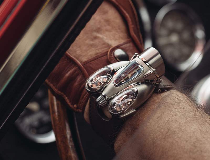 MB&F HM9 Flow 的弧形表殼靈感來自 1940 和 1950 年代為實現(xiàn)空氣動力學性能而設計的車輛。側(cè)面外殼的俯沖線條讓人想起風洞構思的機器及其外殼。MB&F 試圖吸引汽車和航空界的粉絲,因為 HM9 的每個版本的表盤都暗示了不同的主題。例如,MB&F HM9 Flow Air 有一個飛行員風格的手表表盤(和一個深色的機芯),而 MB&F HM9 Flow Road 的表盤靈感來自汽車速度計表盤,并有一個鍍玫瑰金的機芯.廣告訊息廣告信息結束