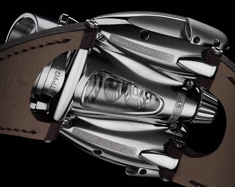 在手腕上,我想 MB&F HM9 Flow 的佩戴會非常像 MB&F HM4。也就是說,一個側(cè)面顯示的手表,看起來像某種類型的飛機坐在你的手腕上。不要忘記,MB&F HM5 也有一個側(cè)面式顯示屏——盡管這更多是受到汽車“駕駛員手表”的啟發(fā)。MB&F HM9 的表殼完全是鈦金屬,其中包括一系列弧形藍寶石水晶窗。MB&F 重點討論了 HM9 外殼的可穿戴性,考慮到奇怪的設計,它可能很容易超級舒適,因為它可能超級不舒服。MB&F 很自豪能夠?qū)⒎庋b尺寸調(diào)整為緊湊的 47 毫米寬、23 毫米厚和 5??7 毫米凸耳對凸耳外殼。我非常期待將其中一個戴在手腕上。表殼防水深度達 30m,由 43 個零件制成。