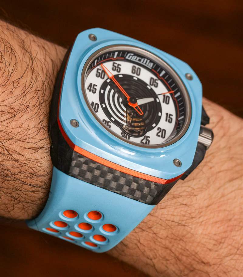 Fastback GT Mirage 表殼呈方形,寬 44 毫米(表冠寬 48.5 毫米),防水深度達 100 米。由于表殼形狀和寬肩帶,它穿得很大——但這就是 Gorilla 想要的外觀。我會爭辯說,盡管尺寸很大,但手表佩戴起來很舒服。對于 Mirage 版本的手表,Gorilla 繼續(xù)采用鍛造碳表殼,在此型號上,表耳結(jié)構(gòu)附近有一些碳纖維紋理(一個容易錯過的細節(jié))。該表殼還使用鋼、鈦、陽極氧化鋁作為表圈下方的橙色環(huán),以及用于表圈本身的陶瓷。這是我見過的少數(shù)幾款使用“粉藍色”陶瓷部件的手表之一——如今這仍然不常見。表盤上方是 AR 涂層藍寶石水晶。廣告訊息廣告信息結(jié)束