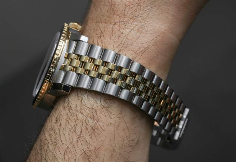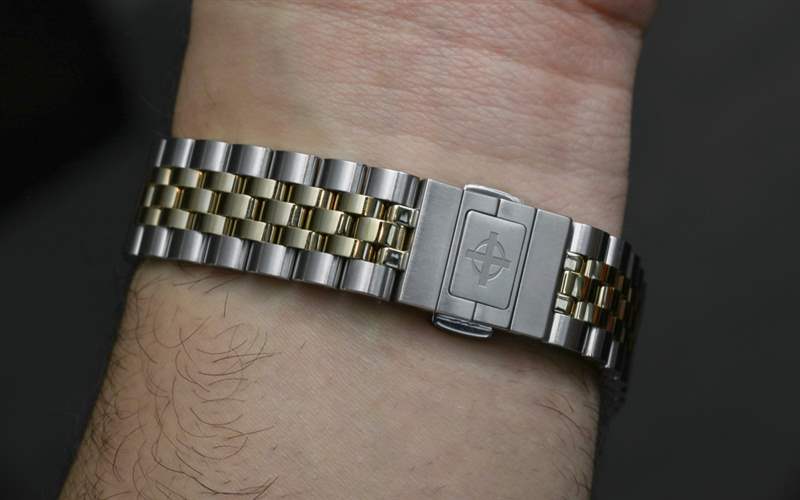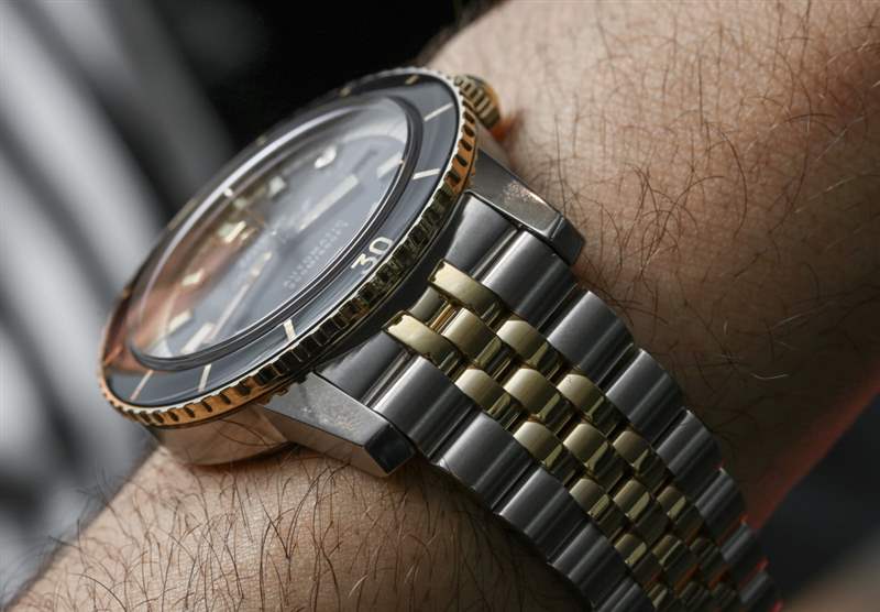 從那里我們可以看到帶有礦物水晶鑲嵌的旋轉金色表圈,其中一些金色的閃光部分發揮了作用。雖然它明顯讓人想起勞力士標志性的 Jubilee 式表鏈,但錐形表鏈非常舒適,并使用鋼制外鏈節和中間較小的拋光金色中心鏈節。廣告訊息廣告信息結束