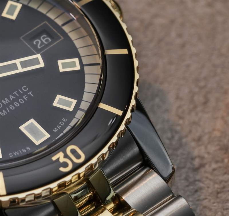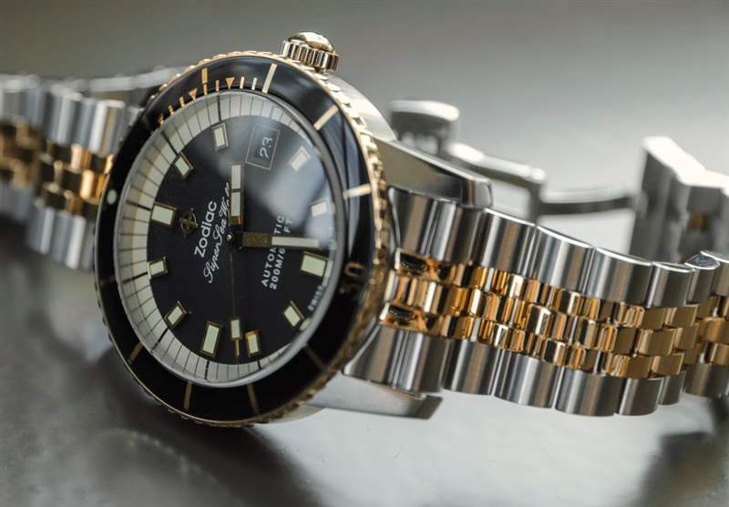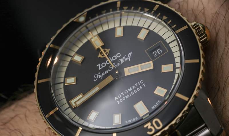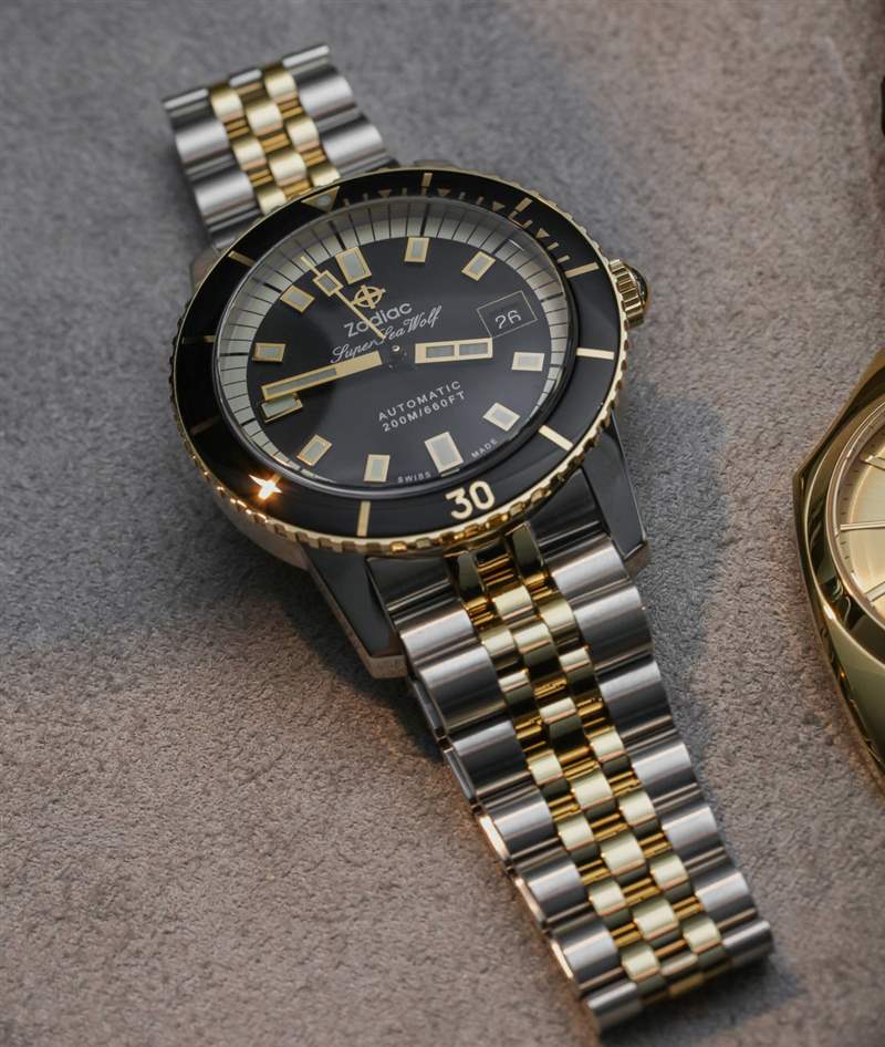 Zodiac 對 Super Sea Wolf Compression ZO9271 手表的定價并不高于產品系列中任何其他類似型號,但黃金當然不是真的。相反,它在表鏈的中心鏈節、表圈、表盤元件和表冠上使用了金色涂層鋼。在這個低于 1,400 美元的價格下,無論如何人們都不會期望真正的黃金,但人們所期望的是良好的機械運動和實用性——這是 Super Sea Wolf Compression 最肯定能提供的領域。廣告訊息廣告信息結束