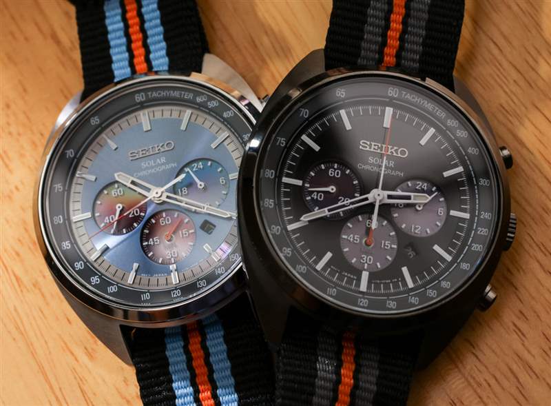Recraft Solar Chronograph SSC667 和 SSC669 僅在顏色上有所不同,但由于采用 IP 涂層黑色外殼,SSC669 的價格要貴 25 美元。該型號的表盤是黑色的,帶有高對比度的白色指針和時標。橙色作為強調色看起來不錯。SSC667 采用天然精鋼表殼和略帶光澤的金屬藍色表盤。精工通過使指針變為灰色來確保指針適合主題,但也通過使指針和時標在紋理上啞光來做正確的事情,以免反射光線。在我看來,這兩款都是漂亮的手表,黑色的 Recraft Solar Chronograph SSC669 更加強壯和陽剛,而 SSC667 的吸引力更加現代和俏皮。現在我們所需要的只是讓收藏家想出一些粘人的名字,讓這些精工 Recraft 手表在命名方面更具個性。