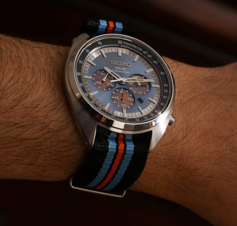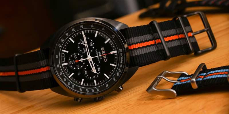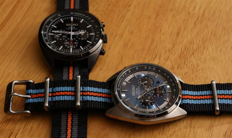 精工將手表與幾乎沒有眩光的扁平 AR 涂層礦物水晶配對。這對我來說是錦上添花,也是表盤看起來如此出色的原因。傾斜的拋光表圈通向拉絲和拋光(側面)酒桶形鋼制表殼,SSC669 提供黑色,SSC667 提供天然鋼。表殼簡單但制作精良,配有對比拋光和視覺美感,使其感覺比實際更薄(約 12.5 毫米厚)。表殼寬 43.5 毫米(防水深度達 100 米),非常舒適,搭配這些彩色尼龍 NATO 風格的肩帶。這實際上是我記得的第一款帶有北約風格表帶的精工手表。雖然 SSC667 和 SSC669 是 2018 年的新型號,它們是以前可用的 Seiko Recraft SSC569 的修訂版——我覺得它沒有那么吸引人。這是一塊不錯的手表,但感覺就像精工試圖將復古賽車計時碼表與正裝手表結合起來,我發現結果有點尷尬。這些 SSC667 和 SSC669 型號具有不同的表盤和表帶,讓世界變得與眾不同。廣告訊息廣告信息結束