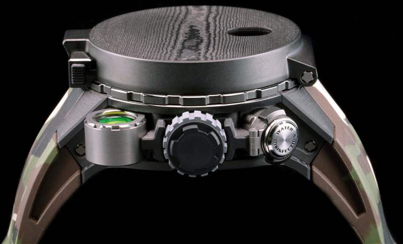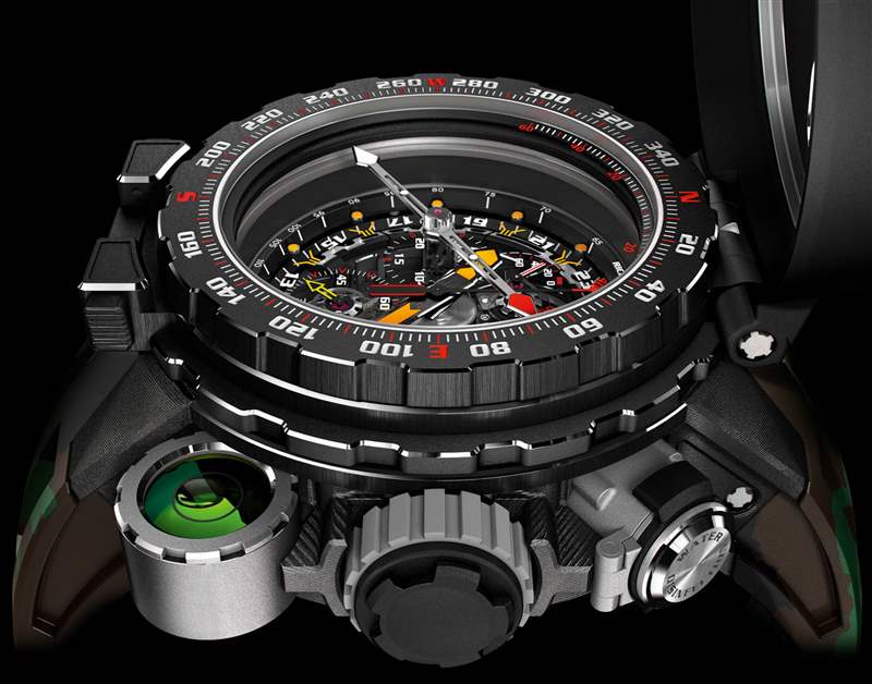 現在是生存主義者的東西。請記住,這款手表是為約翰·蘭博設計的,可用于攜帶他的求生刀。據我所知,Richard Mille 第一次在手表中加入了一個模擬指南針,而對于 RM 25-01,它是可拆卸的。這款手表有兩個表圈選項,其中一個在表盤上有一個折疊鈦和碳 TPT 罩。這是羅盤表圈,它包括一個位于表盤正上方的磁性羅盤指針。