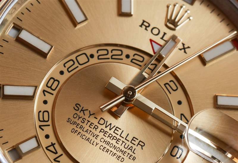勞力士喜歡吹噓 9001 型機芯擁有多少專利(其中七項)。這確實是一個非常復雜的運動。作為一家公司,勞力士實際上喜歡專注于更簡單的機芯,因為它們往往使用壽命更長且需要的服務更少。毫無疑問,9001 型機芯堅固耐用,其復雜性實際上被它的易用性所籠罩。讓我們從表盤上的信息開始。與其他勞力士手表相比,Sky-Dweller 最獨特的部分是表盤上的外露偏心環(huán),用于顯示 GMT 時間。通過紅白箭頭指針在 12 點鐘下方讀取第二時區(qū)。這種展示在推出時既新穎又非勞力士,并立即引發(fā)了爭論。實際上,原始 Sky-Dweller 手表的整個表盤也是如此,這些手表具有各種顏色的阿拉伯或羅馬數字時標。雖然很多人在它剛問世時就欣賞 Sky-Dweller 的新穎性,但很少有人稱它特別漂亮。廣告訊息廣告信息結束