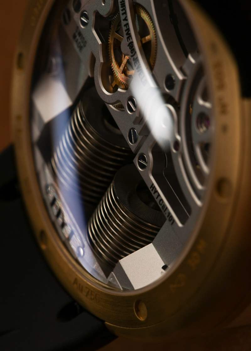 在“液壓機械”時標指示器中與淺金色配對的是黑色液體(或在另一個 2N 金型號中為紅色)。藍寶石水晶“毛細管”管后面是一個發(fā)光條,它在黑暗中發(fā)光,有助于在光線不足的情況下閱讀手表。HYT 的 101 型手動上鏈機芯為 H0 提供動力,就像它為 H1 提供動力一樣。HYT 為機芯中的螺絲帽著色,當機芯表面在光線的作用下反射出紫色陰影——這是我以前在 H0 手表中從未見過的。機芯以 4 赫茲運行,動力儲存 65 小時,分針和秒針顯示在單獨的表盤上,動力儲存指示器位于輔助秒針盤對面。廣告訊息廣告信息結束