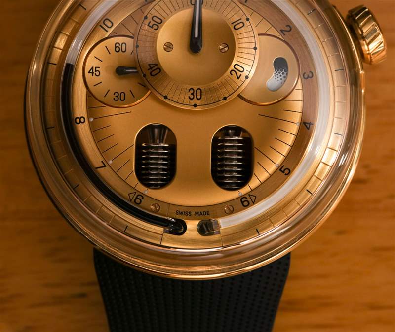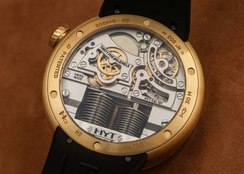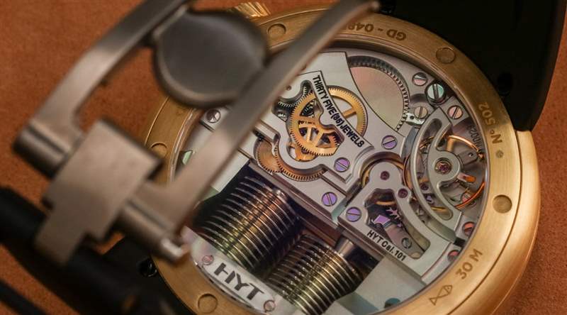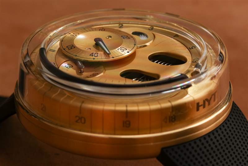 在使液體計時系統(tǒng)正常運行時,緩慢是您的朋友。HYT 101 機芯手表的每個人最喜歡的部分是當液體小時指示器觸及管子末端時看到表盤。這會導致波紋管復位并且相反的液體將指示點一直移動回起點。這可能是你一天只有兩次的最有趣的幾秒鐘。