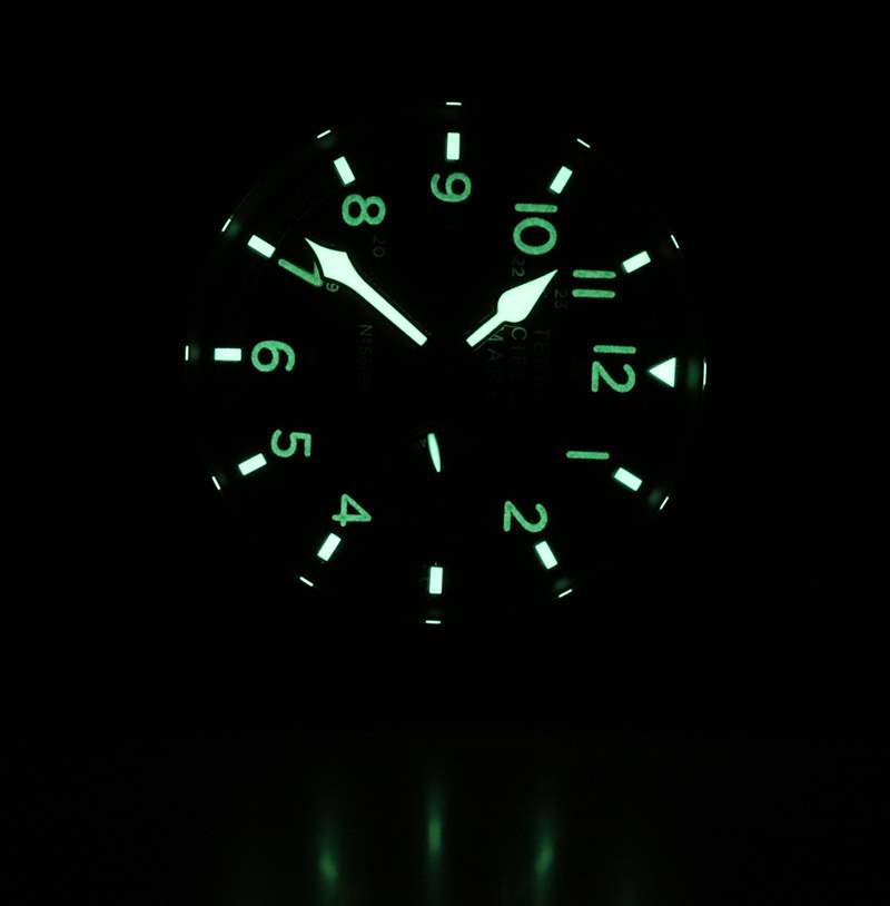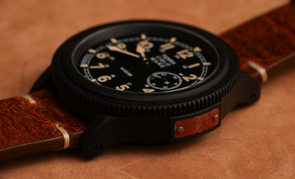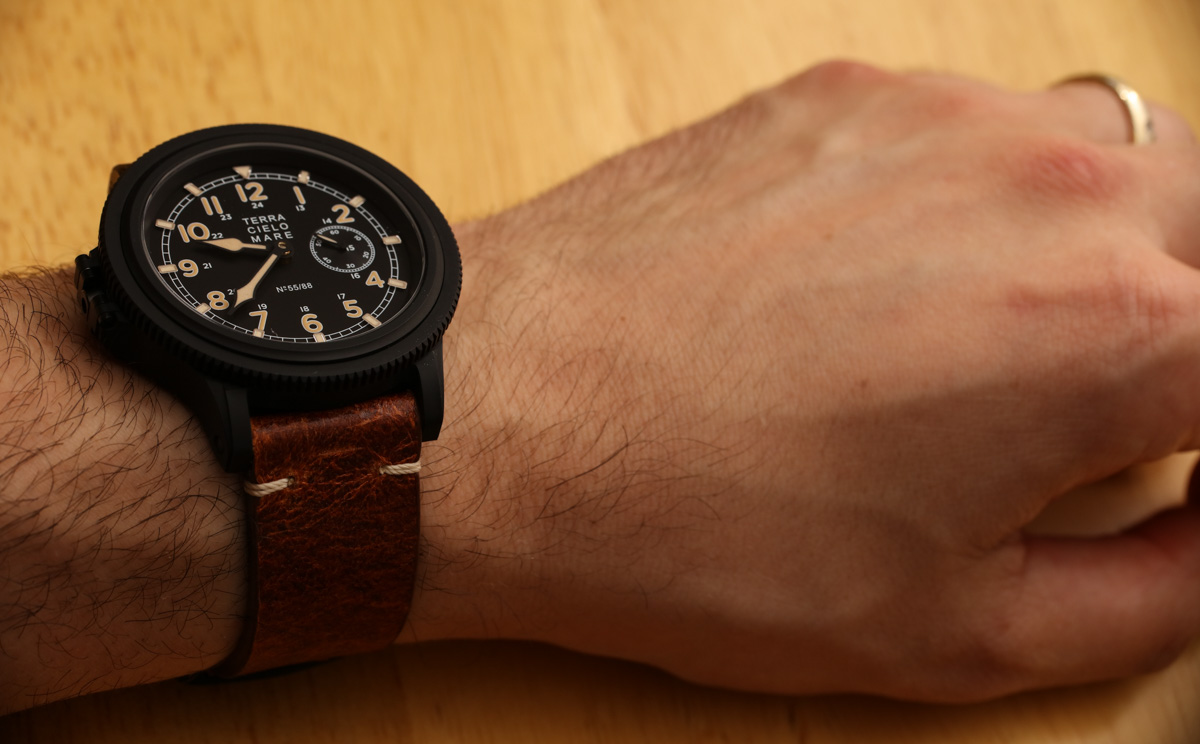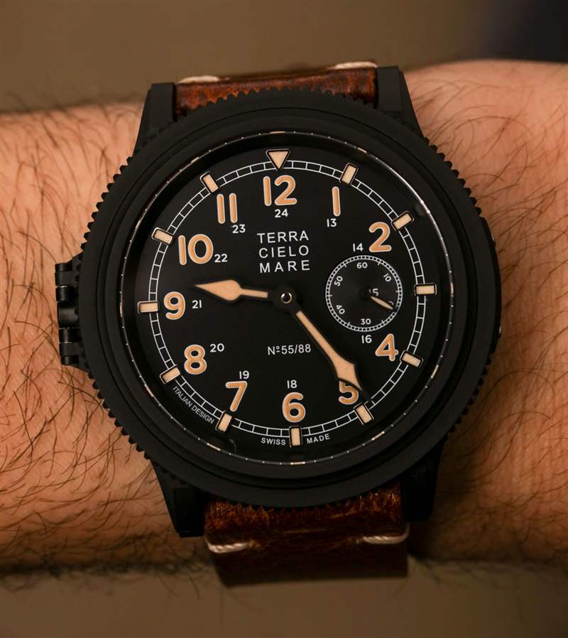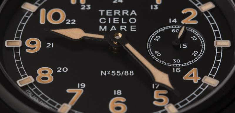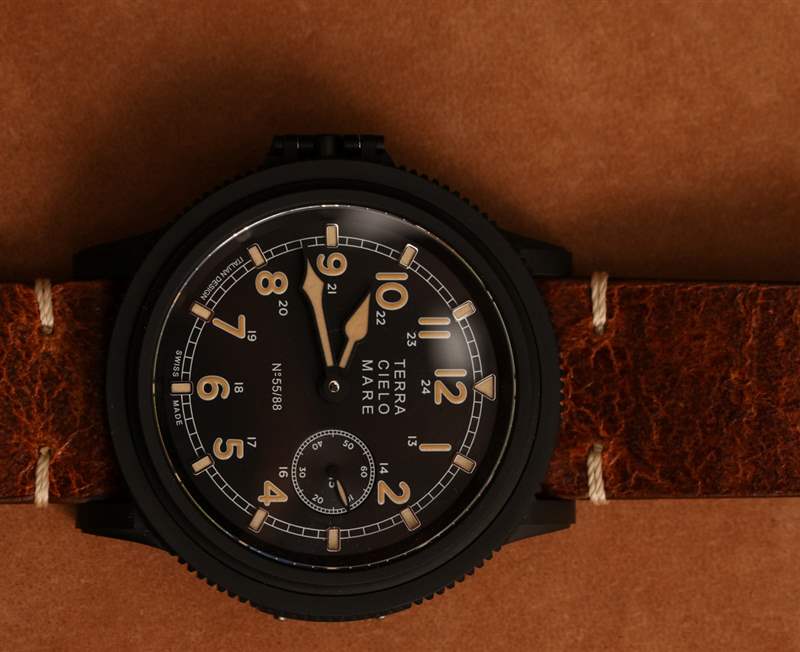 搭配啞光黑色鈦金屬表殼和復古風格表盤,Zero Sen 非常漂亮。說出你對“人造老化發光體”的看法,但在我看來,這種沙色的 Super-LumiNova 很有吸引力,我不在乎它是否試圖看起來像一些老化的東西。整體表盤設計巧妙。Terra Cielo Mare 通過在表盤外圍應用時標來增加深度,這提供了一些引人注目的光反射。里面是阿拉伯小時數字和合適的指針。比例和易讀性都很棒。鑒于機芯的“倒置”方向,小秒盤位于 3 點鐘位置。