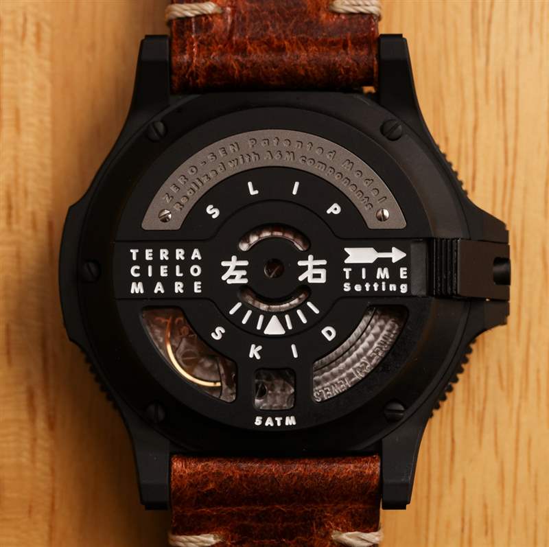 表殼后部有一個半開放式金屬表背蓋在藍寶石水晶上,Terra Cielo Mare 稱之為“兩層背殼”。其設計有一個防滑測斜儀的演繹,帶有日語字符“左”和“右”。表殼本身防水深度達 50 米,采用鈦金屬制成,并帶有啞光黑色 PVD ??涂層。戴在手腕上非常舒適,表殼寬 43 毫米(不包括表冠系統),厚約 15 毫米。我發現它是介于“可穿戴”和“運動”之間的一個非常合適的尺寸。廣告訊息廣告信息結束
